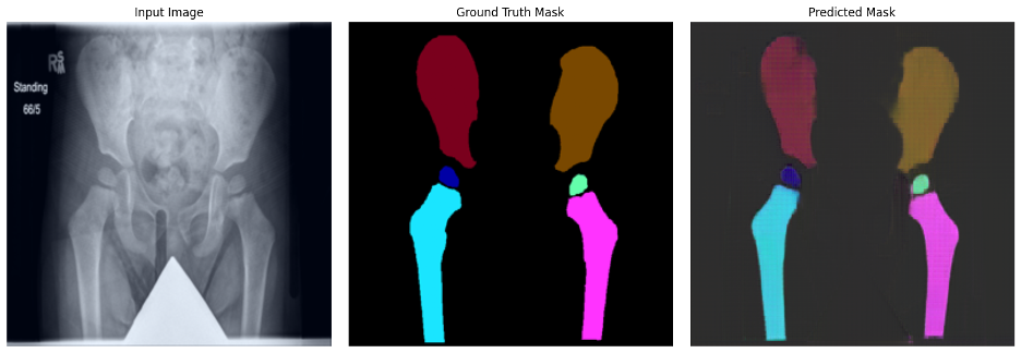 The preliminary result shows the proposed model converges quickly with relatively small samples to finish the training process. Figure 2a shows a predicted sample from the Segmentation Model and Figure 2b shows a predicted sample from the landmark detection model. These models will be used to automate measurement of the acetabular index and the IHDI grade.